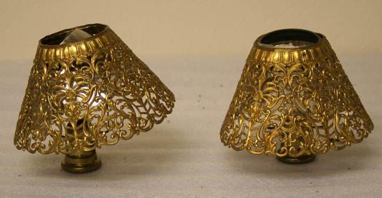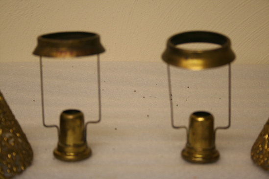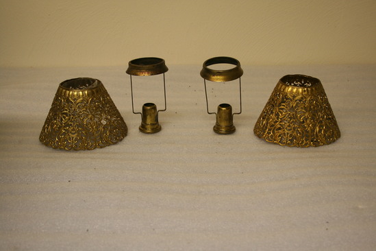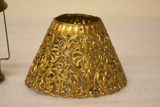 Octagonal base, turned standard with various number and size rings and vases, conventional flare at top. Brass filigree shades with isinglass liners belong to these sticks.