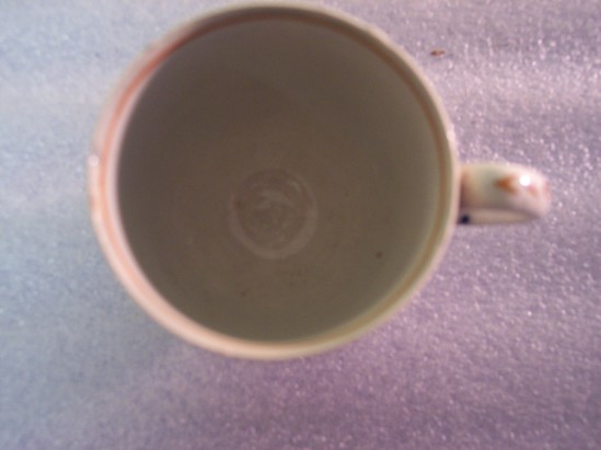 High ring base with yellow glazed line, egg-shaped body with yellow line just inside and outside rim. Blue line and yellow leaf spiral chain on body with green oak leaf connections. High, ear handle with brown YYY lines down the outside.