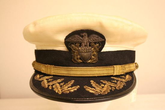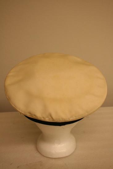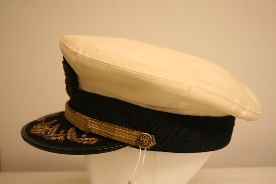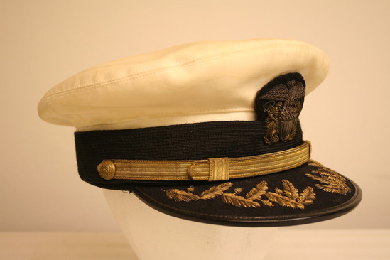 Naval cap - white cotton base; flat top wider than b ase; around base is a black silk ribbon; in the front of the hat half above and half on the black ribbon is an emblem of an eale with a crest and anchors; there is a black visor in front with gold leaves embroidered on it and a gold band attached to hat with two buttons with eagle emblems; interior has a brown leather band with air holes; label "ALL-BILT Uniforms Inc. 147 Fulton St. NYC" on top of hat interior and on leather band