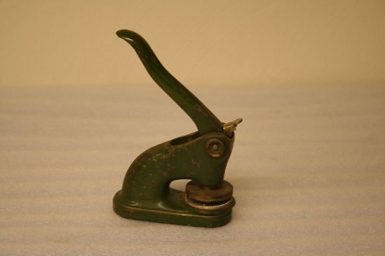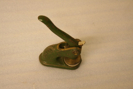 Seal made of iron. Triangular shape with small round seal near bottom. Long handle extending from top of seal that when compressed towards base pushes seal down. Seal plates are brass and say "The Old Church Corporation"
