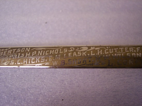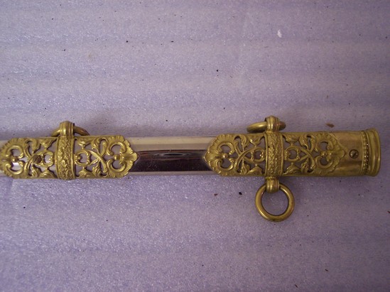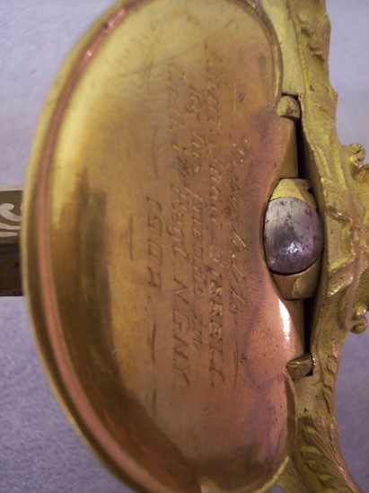 Ornate brass handguards, one hinged and the other with an eagle motif. Lion's head quillon. Single sculpted knuckle bow and many tiered pommel. Mother of pearl grip wrapped with brass wire. Iron blade engraved with names of 64 privates from Co. D 7th Regiment, New York. Also makers mark on blade "Ridabock & Co. New York" near hilt. Iron scabbard has brass tip, throat with rings, and another rring on brass ornament near throat.