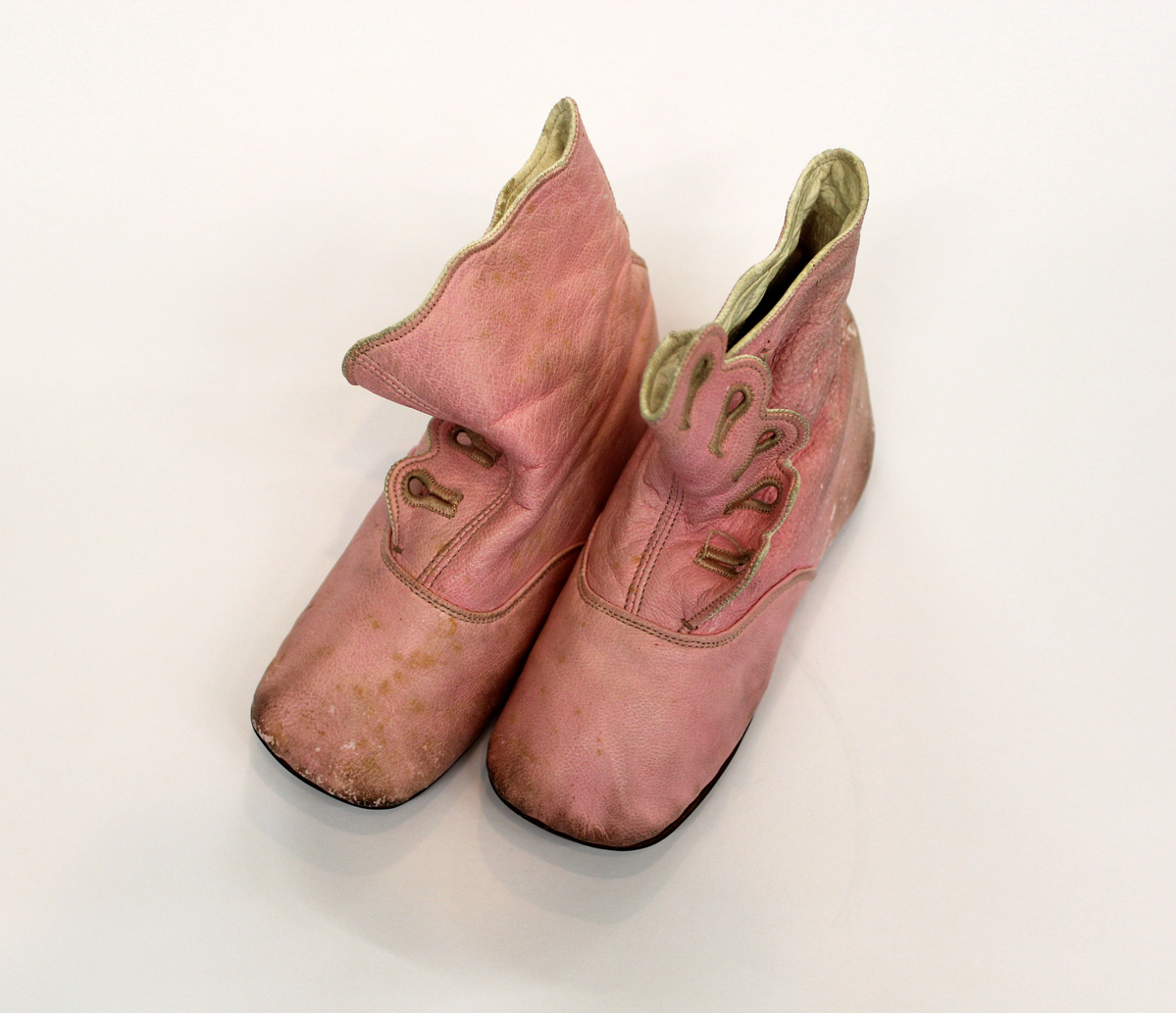 Pair of pink leather child's shoes / boots; scalloped with five buttonholes and glass buttons; leather soles