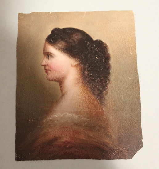 Rectangular (vertical) board painted in oils of a young woman, shown in profile. The young woman is centered in a neutral background. She has dark brown hair, worn in an elaborate hairdo - smooth in front, with a braid wrapped around the crown and a cascade of curls at the back. Her gown has an open neckline with lace edging at the shoulder and an orange-peach drapery/shawl below that. The face of the young woman has very pink cheeks, red lips and blue-green eyes.