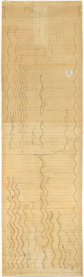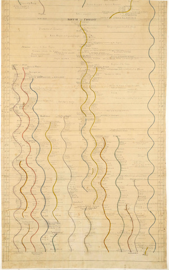 Five sheets of paper that have been pasted together. Chart with years down two sides. Begins with "Fall of Man" on left side of chart. "Birth of Christ" in center and ends at year 1800. Different colored lines show progression and history of different civilizations. Historic and biblical events written next to lines at corresponding dates.