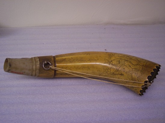 Large end cut in toothed pattern. Closed with metal plate of copper screwed into place, perhaps into wood block inside. Ring in large end tied by string to ring near narrow end. Narrow end light color, rest stained yellow. Ribbed section 2" wide at beginning of yellow section. Then ten trailing plants lengthwise along horn, and at the large end a scene of several men in varied costumes fighting with swords, daggers and rifles.