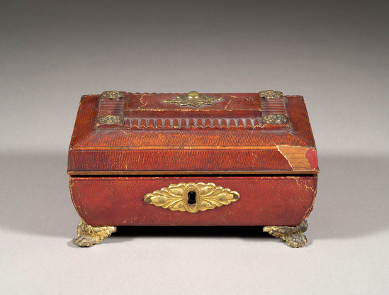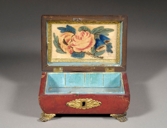 Red Moraccan leather sewing box with theorem painting on the inside cover.