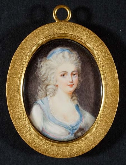 Ivory bust portrait of woman facing center right, grey/blond hair in loose late 18th c. style with blue ribbon, grey eyes. White dress. Frame is modern gilt with rough edge and cross hatch inner edge. Loop at top.