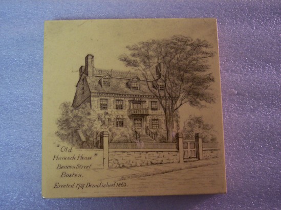 Commemorative tile. Off-white with image of the Hancock House in black. "Old/Hancock House/Beacon Street/Boston/Erected 1737 Demolished 1863." Back states "Published by Macullar Parker & Company. Mintons China Works, Stoke on Trent. Copyright 1888, Macullar, Parker & Company."