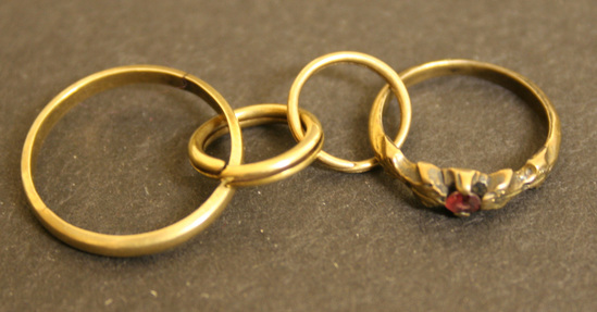 Ring 1911-04-3 is attached via two gold rings to another ring 1911-04-4, both of which had belonged to Mary Tallmadge Noyes. In the photograph, 1911-04-3 is the ring on the right.