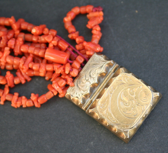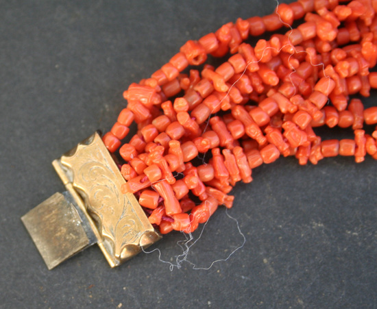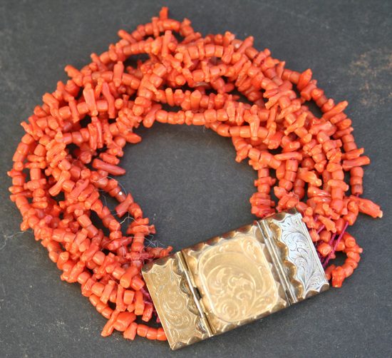 Bracelet - 8 strings of small coral beads held together by square shaped gold clasp - metal pressure wedge clasp with two oblong side panels, one with wedge and other hinged to main panel. All engraved on top with scalloped sides, the center panel is higher than two side panels.