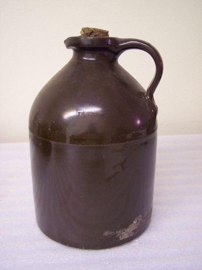 Dark brown jug, glazed, squat spout at top with small ear shaped handle, cork in spout.
