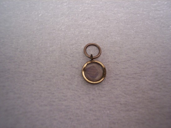 Round locket with wisp of grey hair under glass. Loop ring at top.
