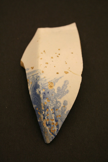 Piece of ceramic; blue design on white; pottery has edge; possibly side of jar