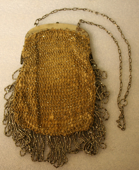 Small beaded purse. Steel frame at top with chain of metal links for a handle. Frame has push lock. The interior of the purse is lined with natural colored linen. The outside is a net of fine, twisted silk on which cut metal beads are strung at intervals. Fringe along bottom and part way up sides of long loops of cut steel beads.