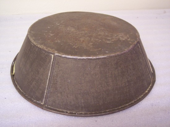 Tin milk pan with narrow rolled rim. Four sides pieced together and bottom piece soldered on.