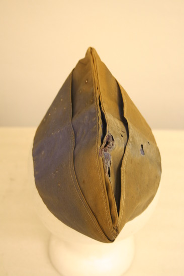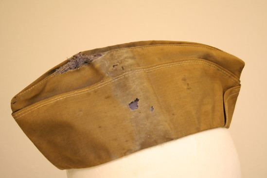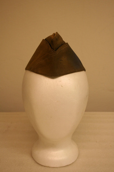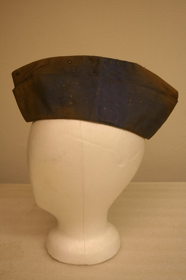 Wedge style American Red Cross cap. Royal blue color, badly faded or bleached out to a brown shade. Lined with a grosgrain ribbon. Tag on ribbon (torn). Inside of cap lined with blue rayon fabric.