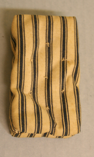 Mattress for doll's bed, blue and white ticking, stuffed with cotton batting