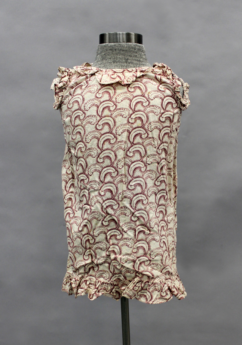 Red and white cotton girl's pinafore printed with feather design; ruffle at arm holes and hem; ties at back of neck; ruffles at neck, arm holes and hem; all hand sewn