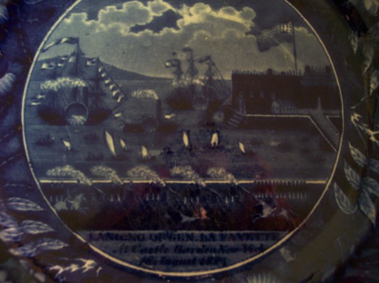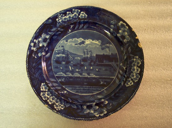 Commemorative plate. White with blue transfer a ship landing and the words "Landing of General La Fayette at Castle Garden, New York, 16 August, 1824."