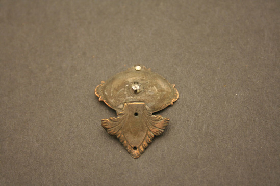 Buckle or latch - two pieces which clip together; smaller pieces look like an acanthas leaf - points away from center, small hole at bottom; larger piece oval - small clear stone or brilliant in center (which when pushed to one side releases catch underneath) Mechanism to release on underside of oval piece - thin fish hook shaped piece of metal that when retracted allows the catch to release and two piece separate