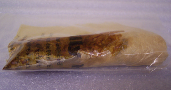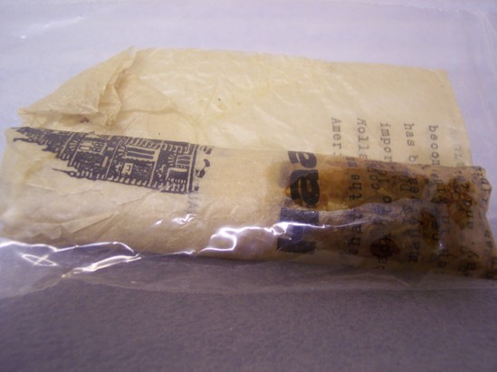 A - Glass vial with wax and string seal, containing brown oil, printed paper label with insignia and "Haarlem-Holland/Haarlem Oil" Oil has leaked onto paper. B - Accompanying document folded in half and wrapped around the vial, printed on waxy paper, "Declaring this to be Tilly Haarlem Oil the original manufacturers of old fashioned Haarlem oil dating back to 1696 imported from Holland"