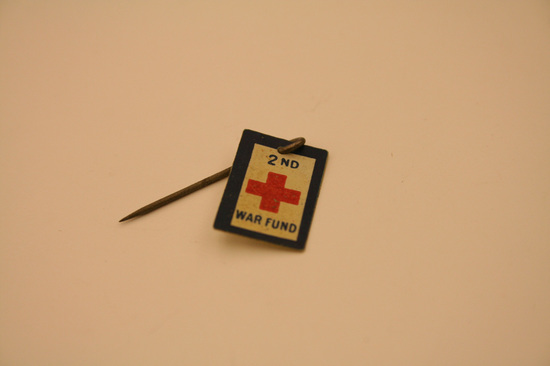 Stick pin, bent 90 degrees at top with ring at end. Attached is a rectangular charm with blue border, white center, and red cross insignia. Blue text "2nd/WAR FUND" above and below cross.