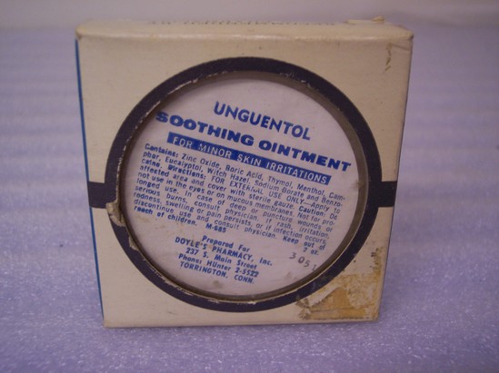 A: round white tin with blue print full of "Unguentol Soothing Ointment" for minor skin irritations. Prepared for by Doyle's Pharmacy, Inc. 237 Main Street. Phone Hunter 2-5522, Torrington, Conn. B: White cardboard box with circular clear mylar window for reading top of tin