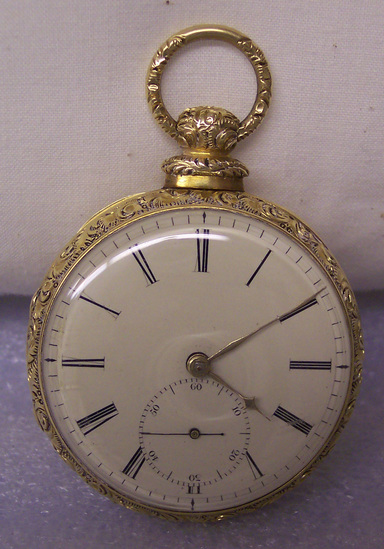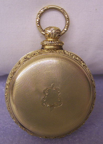 Open face gold watch with flat spot in crystal over center. Covered with glass. Roman numerals with second dial in arabic numbers. Simple gold hands. Flat knob with floral casting and ringwith casting 3/4" up. Edges or case heavy floral casting with engine turned back cover with rococo sheild in center. Enclosed works.