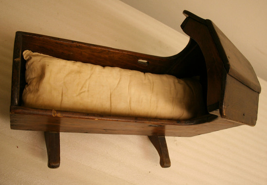 Doll's wooden cradle. All wood held together with iron nails. Hood above top of cradle. Two rockers - one at each end that extends past width of body of cradle. Two small round handles on either side of cradle. Cotton mattress inside cradle - handsewn, stuffed with cotton batting