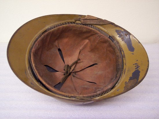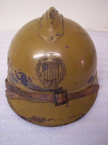 Steel military helmet of WWI French design. Painted olive tan on outside. Leather strap with buckle strapped around outside of brim. Leather head cushion with tie to adjust for head size. Lined with pieces of tin for added protection. American Field Service Insignia on front of helmet.