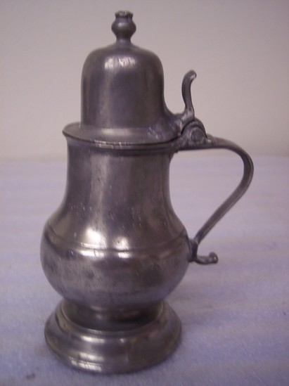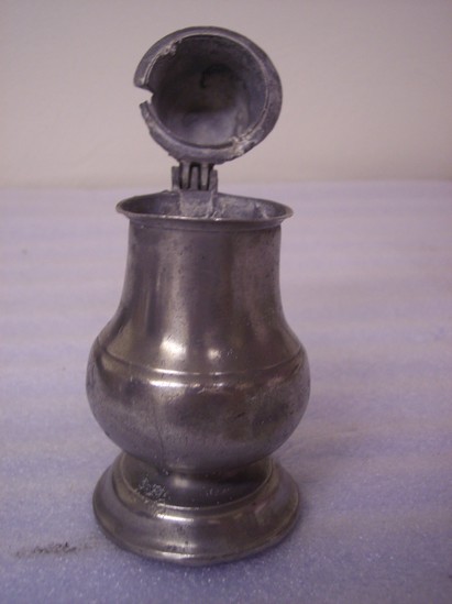 Round stepped base, bulbous body. High domed lid with bud finial cut for mustard spoon. Cover hinged to handle with raised thumbpiece. Strap handle.