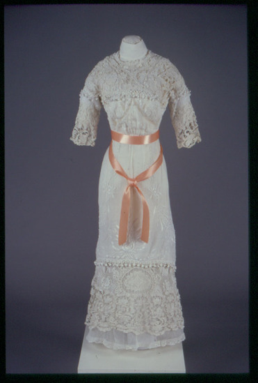 Woman's summer formal dress of sheer with cotton with white embroidery and white crochet insets. Short sleeves with crochet edging, crochet yoke neck with pompoms, body and full length skirt with white embroidery, crochet panel around hem of skirt. Built-in tulle underskirt. Apparently had black velvet sash and panel around hemline, removed later. Worn by Mrs. Samuel Fisher to "Black and White" Balls c. 1900.