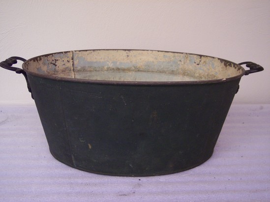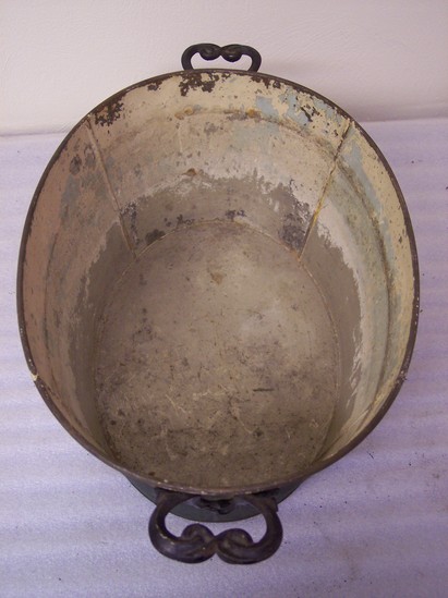 Oval tub with flared sides of four plates soldered together and a roled rim at the top. Fancy cast handles at the short sides of a leaf motif. Exterior painted dark green, interior white over a turquoise layer. Bottom still shiny tin.