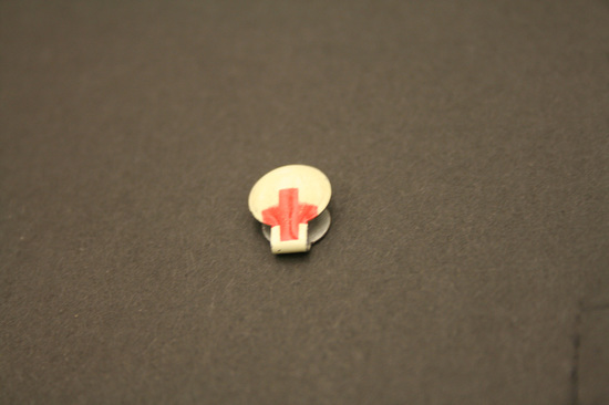 Round pin, raised in center, white with red cross at top. Arm at top which is bent is bent 180 degrees to touch back of pin