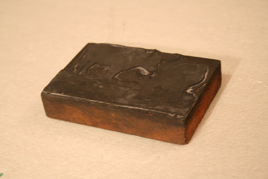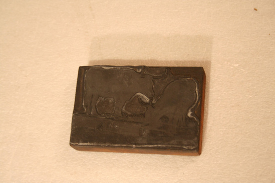 Stamp with wood base, remnants of paper glued to back side; stamp side raised design of two steers - one standing on top of a rectangular platform. Image carved out of rubber like material that is nailed to wood
