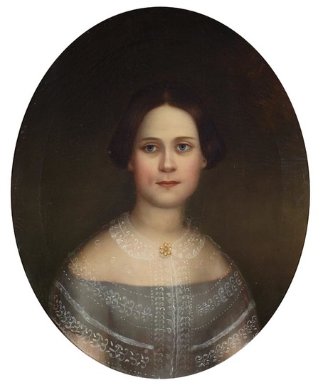 Portrait of Charlotte Deming. Oval frame with figure in center. The sitter has her hair up and parted down the middle. She is wearing a grey dress wth a sheer mantel depicted as lace clasped with a flower brooch. The background is dark and plain. It is speculated that the background was darkened after her death and that possibly the shawl was added later then the original painting as well to convey more modesty to the sitter.