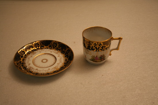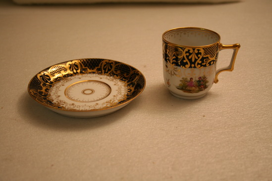 a: tea cup - cylindrical shape with small base. C shaped handle with hard corners, blue border at rim of cup with intricate gold design over top, two painted scenes of couples with musical instruments, maker's mark on underside - cone with two lines across body "Germany" written underneath in script b: plate - same maker's mark on underside of plate, blue border around rim of plate with intricate gold desing over top, recessed area in center where cup rests