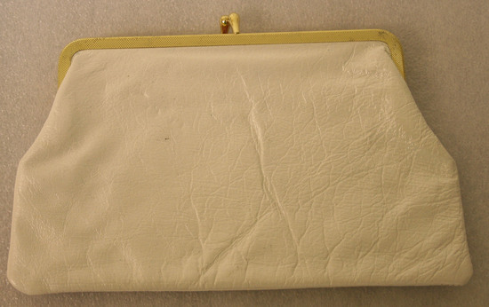 Clutch purse of leatherette, metal gold snap and trim, pink plastic lining.