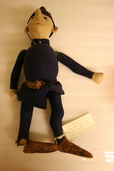 Very stout male in blue felt jacket and pants, leather pointed shoes (felt soles, white), leather belt with steel buckle, white head at collar. White felt hands and face with black glass ball eyes. Blue felt hat with leather brim. Two glass white beads on coat tails, red and white threads at jacket cuffs. Likely meant to resemble a policeman or soldier.