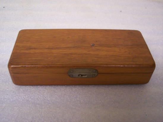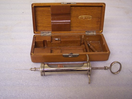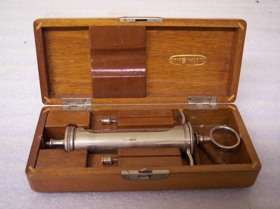 Wooden box with rounded corners. Steel hinges. Inside contains glass and steel syringe with two needles and two pieces of rubber hose. Lid of box stamped "G. Tiemann and Co." in gold