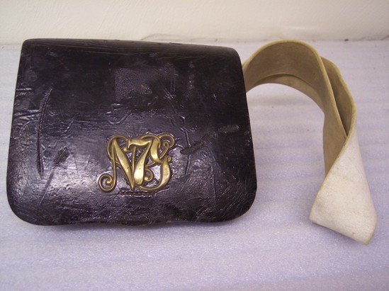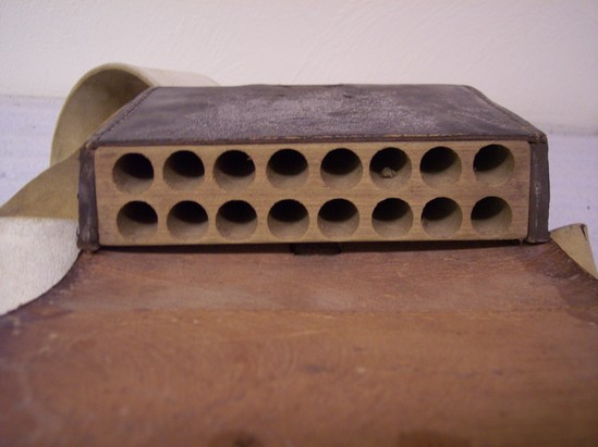 Black leather pouch with fold over flap lid. Wooden liner inside pouch with 16 identical holes. On exterior of flap is brass emblem "NC7" Flap holds to pouch with leather strap and metal button. Connected to back of pouch is long white strap, leather. Branded on side of strap "A.E. WHITE. K.CO."