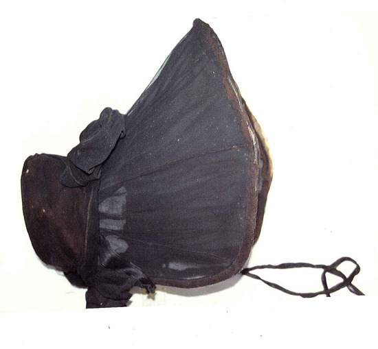 Woman's Hat, Mourning Hat, black crepe bonnet, see through brim of two layers of black crepe, black crepe over opaque brown crown, black crepe bow and rose in back. Worn by Mrs. Silas Cheney at the funeral for her husband, Silas Cheney (d. 1821) the Litchfield cabinetmaker.