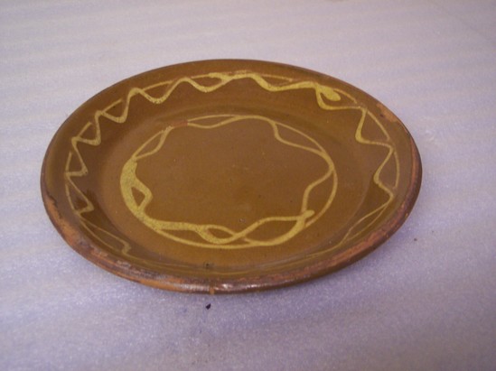 WIDE SHALLOW DISH WITH SLANTED SIDES, ROLLED RIM, PLAIN BASE. CLEAR GLAZE WITH YELLOW SLIP LINE DESIGN. UNGLAZED BOTTOM.