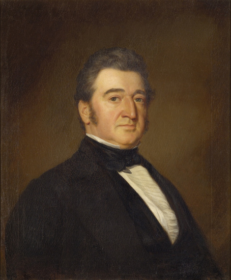Depicts bust portrait of middle-aged man with ruddy face, dark wavy brown hair and side burns, and blue eyes. He wears a black dress suit coat, white pleated shirt and black tie.