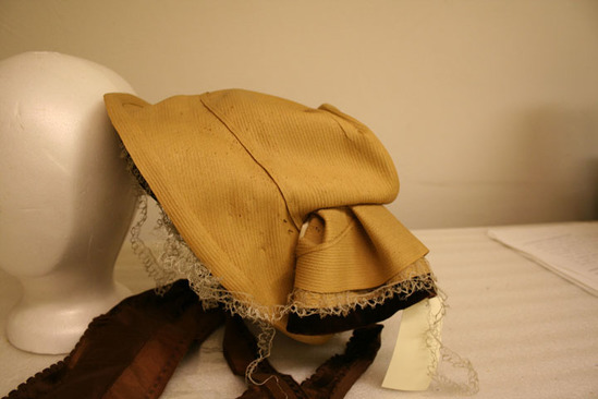 Natural colored straw bonnet; brim trimmed with beige silk, white lace and brown velvet; base of back wavy and trimmed with brown velvet; two sets of brown silk ribbon ties - one set 3/4" wide
