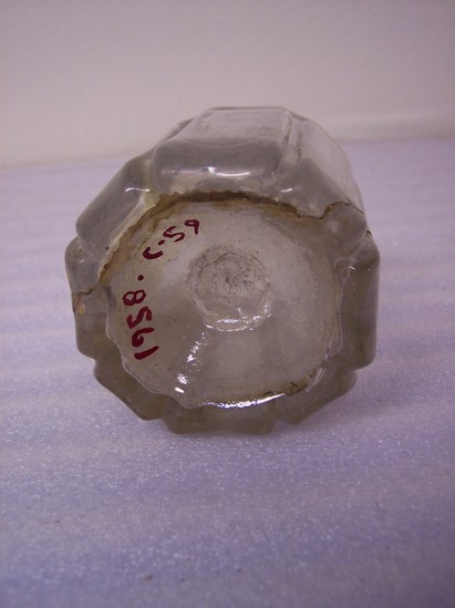 Round, 8 paneled sides with domed shoulder raising to tapered neck,w ith triple ridge screw ring on neck and no pronounced lip. Pontil mark on base of bottle
