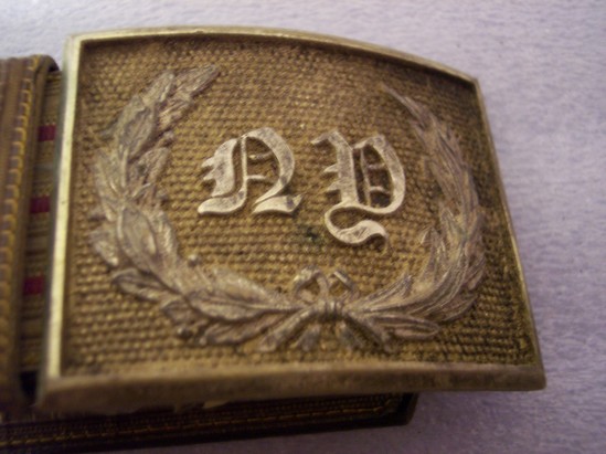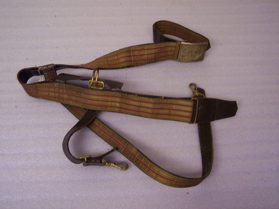 Reddish/brown leather belt. Outside covered in heavy gold silk with thin red stripping. Brass buckle with raised acanthus leaves and "NY" in center. Two thinner straps with brass clasps at end extend downward from belt. Also covered in gold silk with one thin red stripe.