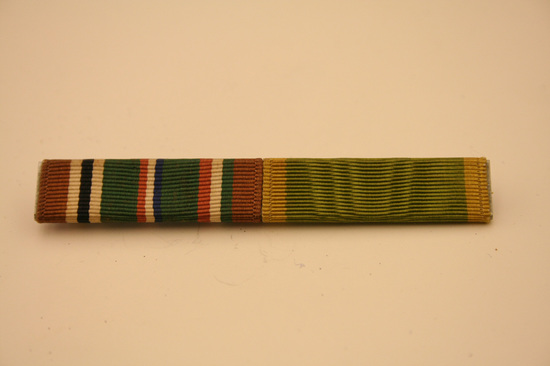 Two ribbon bar pins from WWII. One has thin yellow bands on either side of a green band, and is from the Women's Army Corps (W.A.C.); the other has bands of white, black, blue, red, brown, and green, and is for the European-African-Middle Eastern Campaign medal.