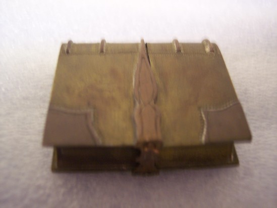 Brass lighter shaped like a book. Copper hand around center. "Book" pulls apart in center to reveal lighter.