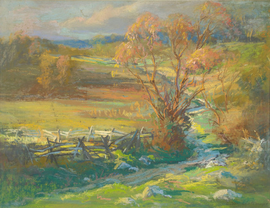 Brightly colored pastel picture of landscape scene. Picture shows a road curving into the distance with a rock wall running along the left side of the road. Trees with autumn colored leaves on either side of road and in distance. Blue sky with pink clouds. Framed under glass with brass plaque affixed to center bottom of frame, embossed with "Perkins' Pasture/by A. Sheldon Pennoyer"